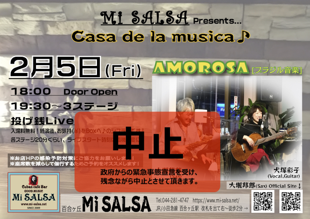 2月5日(金) 新型コロナウイルス感染症対策による緊急事態宣言を受け中止とさせて頂きました m(__)m