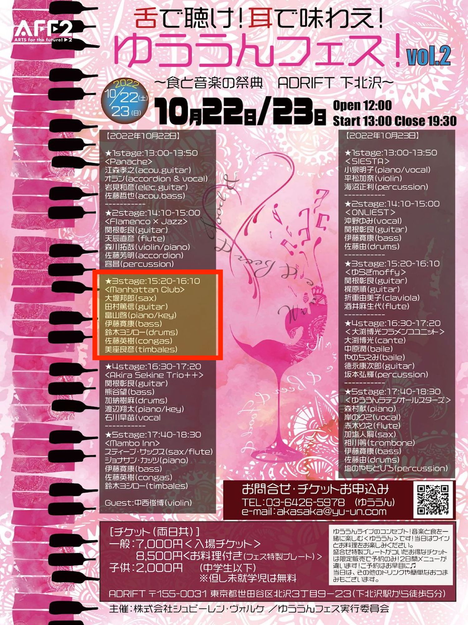 3. 15:20〜 Manhattan Club : 大堰邦郎(Sax),田村篤信(Gt),畠山啓(Pf/Key),伊藤寛康(Bs),鈴木ヨシロー(Dr),佐藤英樹(Con),美座良彦(Tim)
